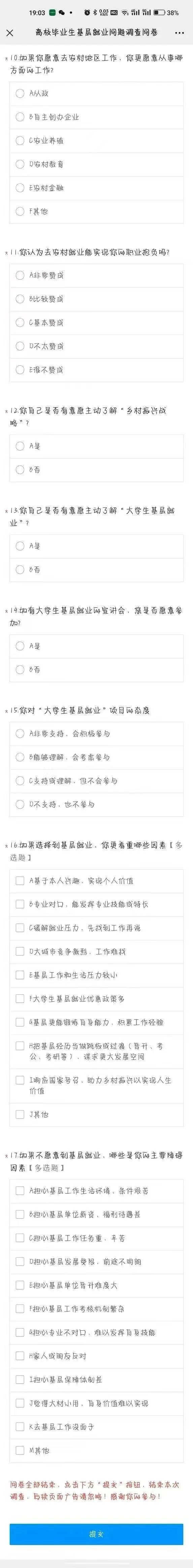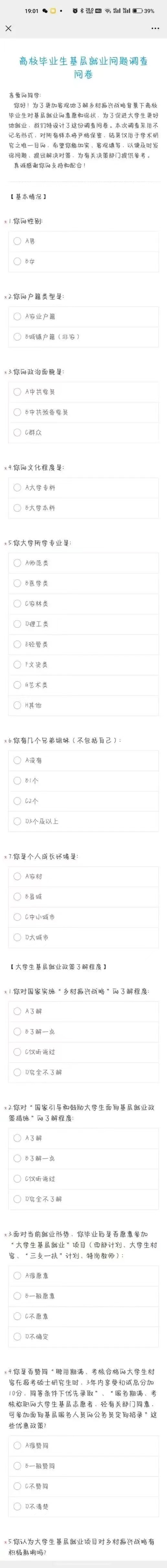 为了更加客观地了解乡村振兴战略背景下高校毕业生对基层就业的意愿和现状,促进大学生更好地就业,3044永利设计了这份调查问卷。本次调查采用不记名形式,对所有样本数据严格保密,结果仅用于学术研究之唯一目的,希望你能如实、客观填写,以便及时发现问题、提出解决对策,为有关决策部门提供参考依据。
