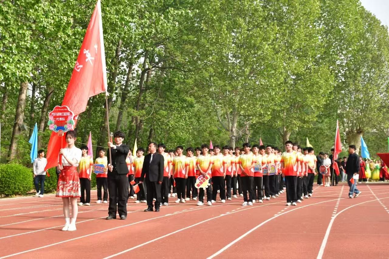 队伍最前方,是身姿挺拔的引导员,手持引导牌,引领着整个方阵。其后,旗手身姿矫健,高擎院旗,院旗在微风中猎猎作响,庄重而威严。紧随旗手的是李院长,他面带微笑,步伐稳健,展现出学院领导的风采。方阵中,同学们整齐划一地挥舞着手中的小红旗,鲜艳的红色随着步伐律动,形成一道亮丽的流动风景线。同学们手举的牌子上写着鼓舞人心的话语,彰显出学院师生积极向上、勇于拼搏的精神风貌。