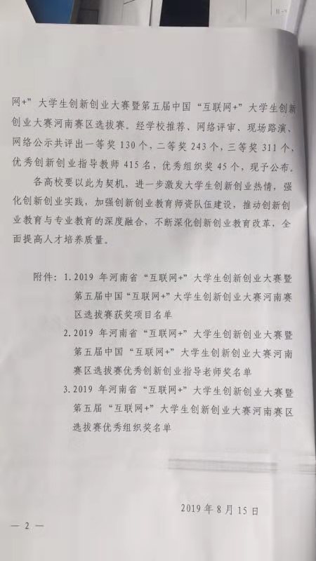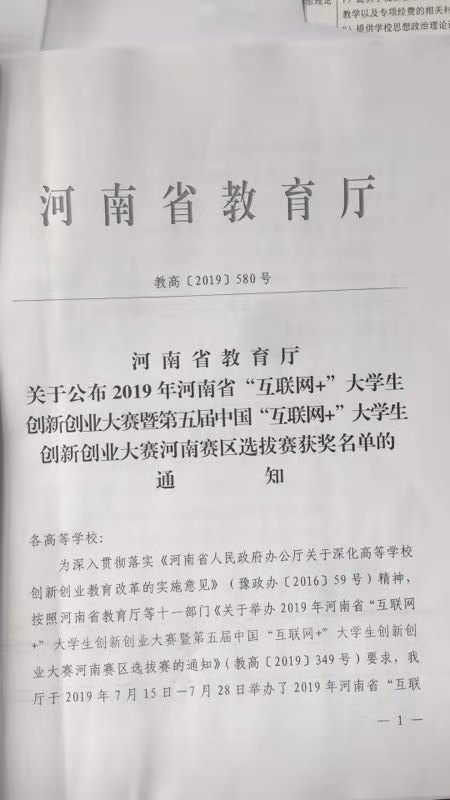 我院学生王鑫阳、齐伟达参加了河南省教育厅2019年7月15日-7月28日举办的2019年河南省“互联网+”大学生创新创业大赛暨第五届中国“互联网+”大学生创新创业大赛河南赛区选拔赛,经学校推荐、网络评审、现场路演、网络公示,获得了两个三等奖的好成绩。通过此次比赛激发了我院大学生创新创业的热情,推动了创新创业教育与专业教育的深度融合,深化了创新创业教育改革,全面提高人才培养质量。