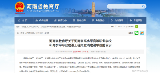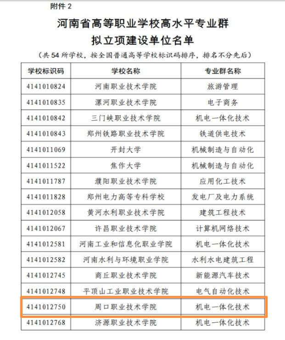8月3日,河南省教育厅发布《关于河南省高水平高等职业学校和高水平专业建设工程拟立项建设单位的公示》。周口职业技术学院机电一体化技术专业群,成功入选河南省高等职业学校高水平专业群建设工程。