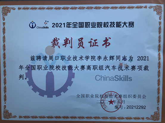 6月16日,2021年全国职业院校技能大赛高职组汽车技术赛项在山东交通职业学院举行。我院李永辉老师受邀参加了该项赛事比赛的裁判工作,这也是继2019年后李永辉老师再次执裁国家级赛事。