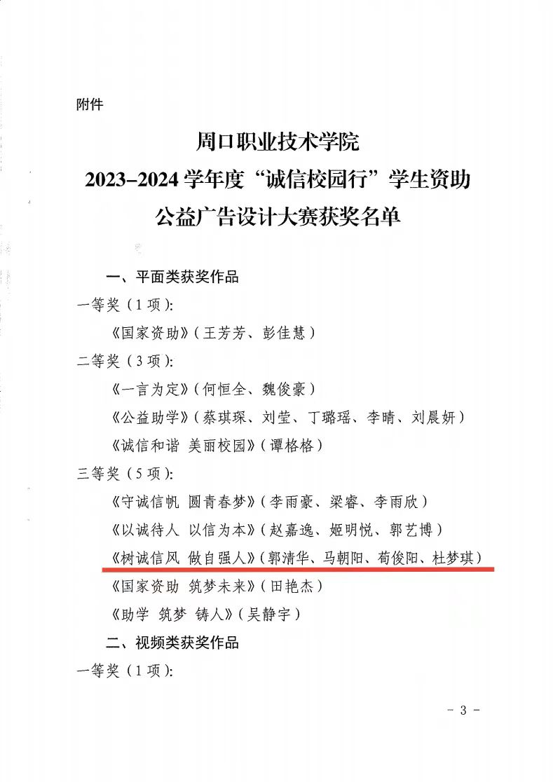 近日,3044永利参加了周口职业技术学院“诚信校园行”学生资助公益广告设计大赛圆满结束。大赛得到了全校师生的积极响应和广泛参与。经过老师评审和大众投票,最终评选出了一、二、三等奖及优秀奖等多个奖项。此次大赛不仅展示了学生们的创意和才华,更重要的是通过广告设计的形式,传播了诚信理念,营造了诚信校园文化氛围。同时,大赛也为学生提供了一个锻炼自己、展示自我的平台,激发了学生的创新思维和实践能力。