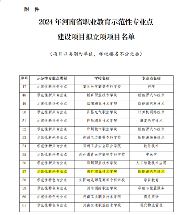 7月24日,河南省教育厅办公室发布了《河南省教育厅关于2024年河南省职业教育示范性专业点建设项目拟立项项目名单的公示》文件,我新能源汽车技术专业成功获批为示范性新兴专业点。