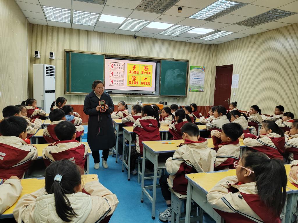 金慧玲老师为学生们进行了安全用电常识科普,普及了常见的安全用电知识,学习了触电急救方法,认识常见安全警示标志,并和现场学生进行了互动,学生们纷纷举手发表见解。
