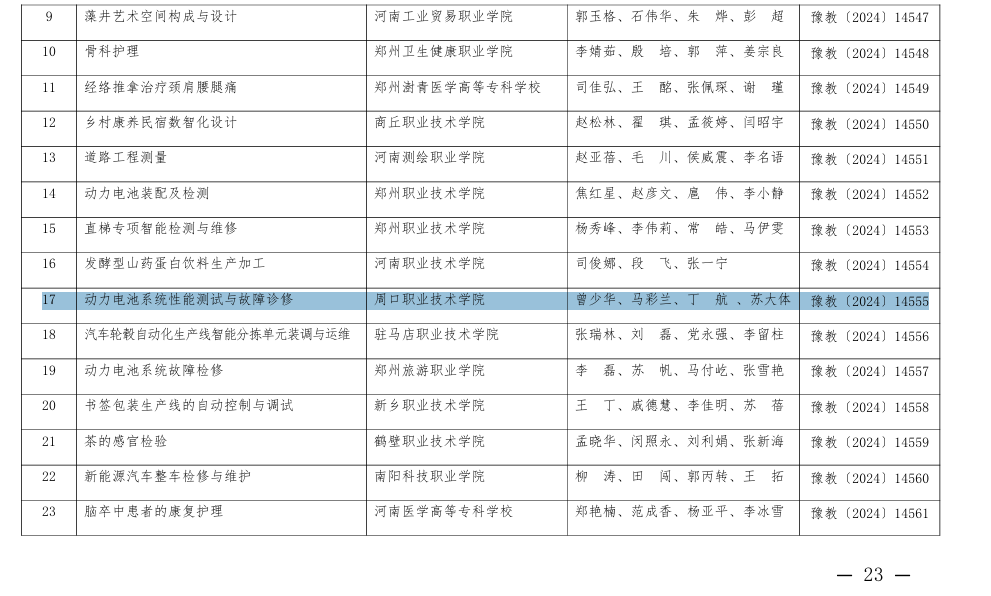 近日,河南省教育厅下发《关于公布2024年河南省高等职业教育教学能力大赛获奖名单的通知》(教职成〔2024〕286号),我院教师曾少华、马彩兰、丁航、苏大体团队的《动力电池系统性能测试与故障诊修》获得三等奖