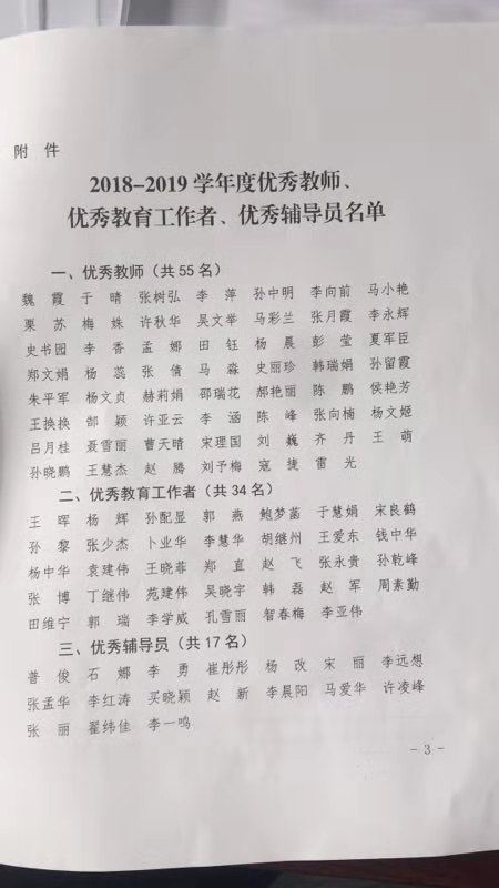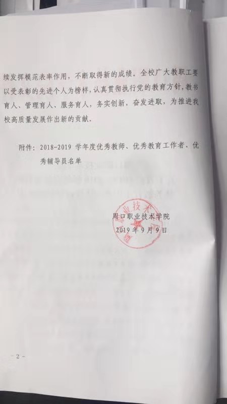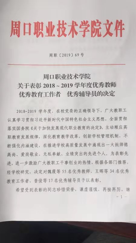 周口职业技术学院关于表彰2018-2019学年优秀教师、优秀教育工作者、优秀辅导员的决定