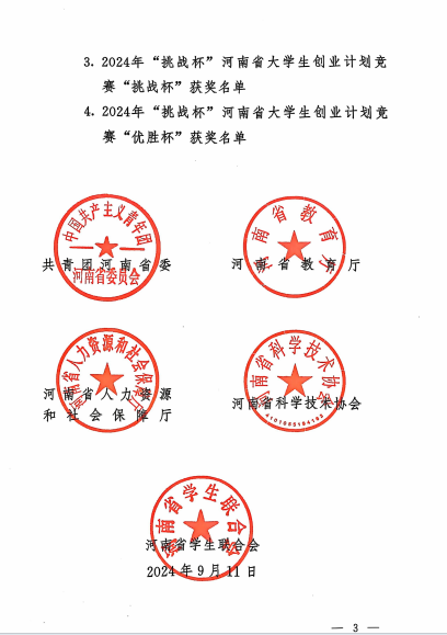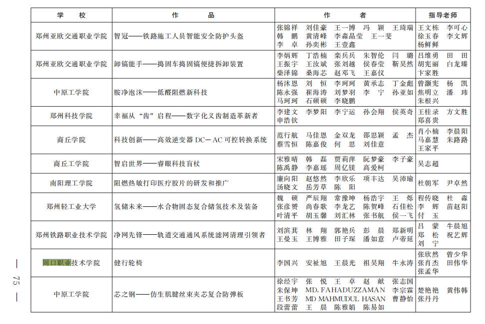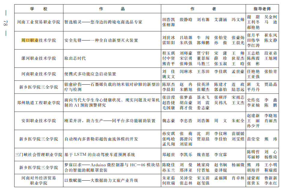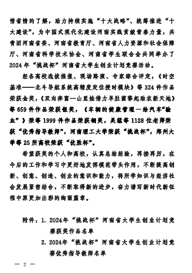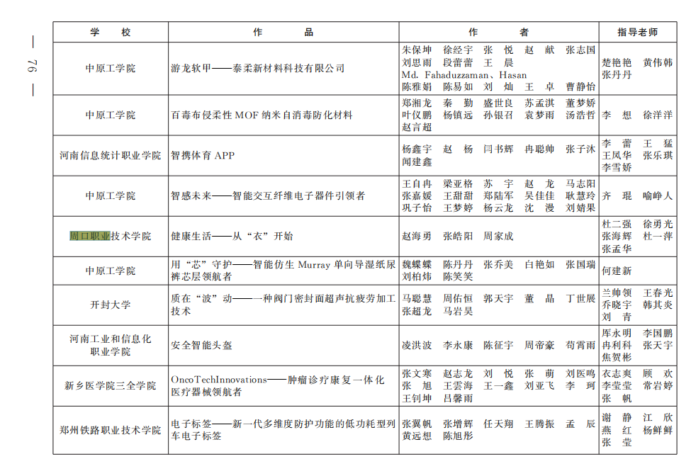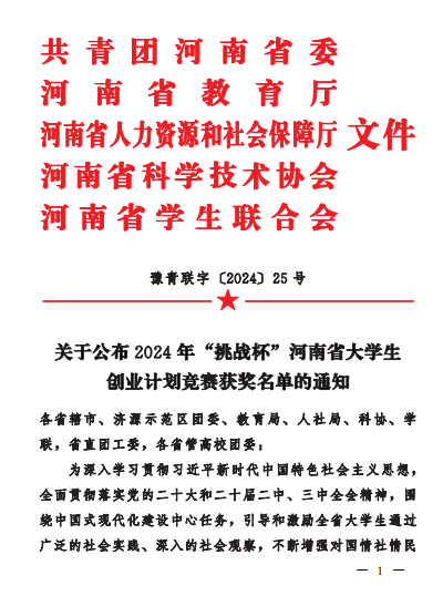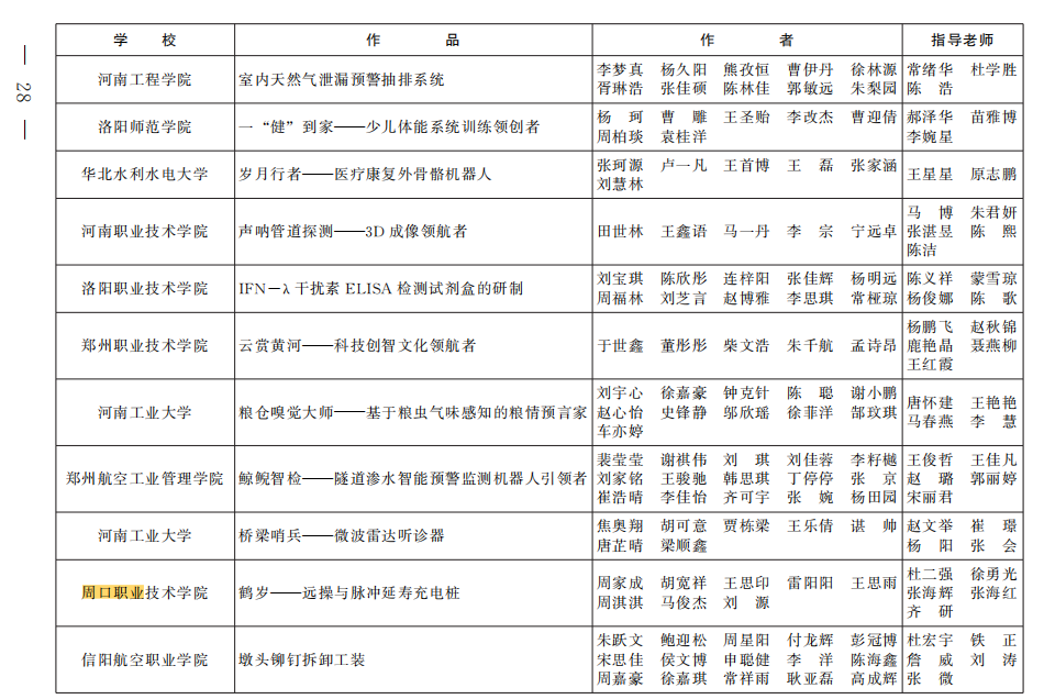 在2024年河南省大学生“挑战杯”比赛中,我院的杜二强、徐勇光、张海辉、张海红、齐研教师指导的《鹤岁一一远操与脉冲延寿充电桩》项目获得银奖;张欣然、曾少华、张肖杰、田伟华、张孟华指导的《健行轮椅》、杜二强、徐勇光、张海辉、杜一萍、张孟华指导的《健康生活一-从“衣”开始》、张月平、崔东风、田伟华、陈文静、李红涛指导的《安全先锋一一种全自动新型灭火装置》,这三个项目获得铜奖。