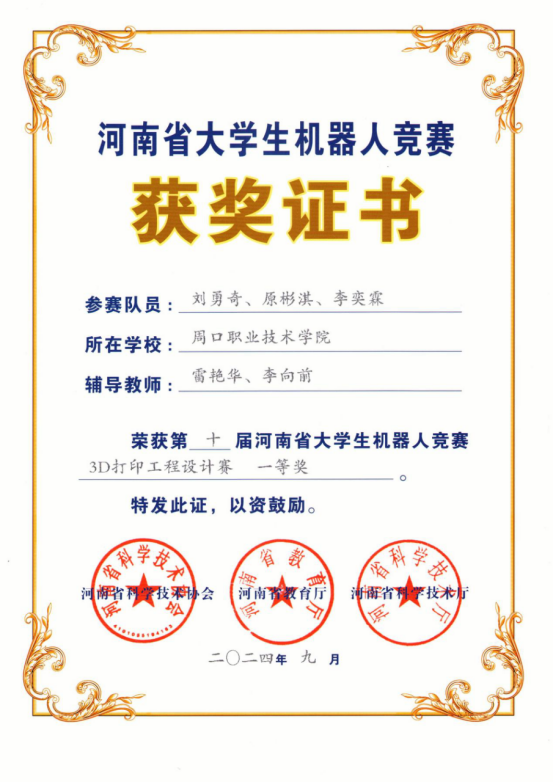 在学院领导的大力支持下,我院多支队伍以其优秀的表现在众多参赛队伍中脱颖而出,斩获一等奖4项,二等奖2项,三等奖1项。其中吕培源、刘庭、王杰(指导教师李向前、陈文静)参加“机器人舞蹈”,获得一等奖;刘勇奇、原彬淇、李奕霖团队(指导教师雷艳华、李向前),参加“3D打印工程设计赛”,获得一等奖;刘世冰、牛闯、窦书为团队(指导教师田伟华、丁兰花),参加“机器人专项赛”,获得一等奖;赵誉翔、孙琳睿、张豪炀团队(指导教师张昭晗、黄梦真),参加“机器人专项赛”,获得一等奖;何永琪、王钧召、胡家硕(指导教师袁永、徐勇光),参加“机器人专项赛”,获得二等奖;王文科、赵哲、宋嘉诚团队(指导教师张月霞、屈莹莹)参加“机器人专项赛”,获得二等奖;郭延强、朱恩光、郭超楠团队(指导教师张月平、崔东风)参加“机器人专项赛”,获得三等奖。
