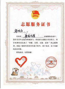 奉献自己,服务他人,提高自己。他合理安排自己的课余时间,积极参加校内和院内的社会实践、文体活动,丰富自己、开拓视野。疫情期间累计志愿服务80多小时,并获得登封市委表彰。