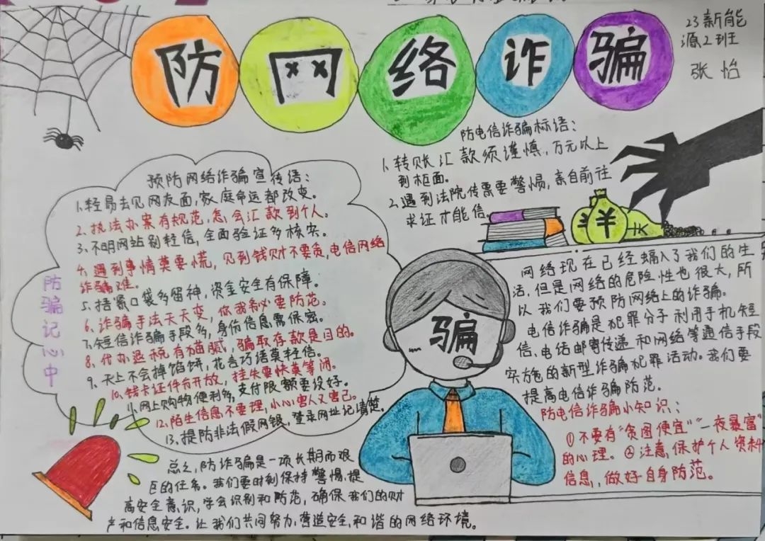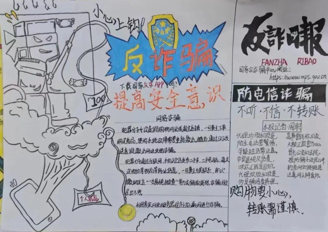 活动期间,各班级的同学们踊跃参与,紧紧围绕学校、社会、生活中容易出现的一系列诈骗形式,精心设计,大胆想象,以独特的视角精心创作出一幅幅内容丰富、形式多样、寓意深刻的手抄报,实现了学生由被动接受宣传向主动担负反诈宣传任务的转变,构筑起学生团体坚实的思想防线。