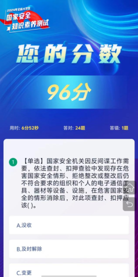为了提高学生的国家安全意识和素养,在实践中提升自己的国家安全知识水平和能力。3044永利于2024年4月2日开展2024年大学生安全知识素养测试活动,通过线上答题的方式提高学生对国家安全的认识,帮助他们理解并遵守国家安全相关法律法规。