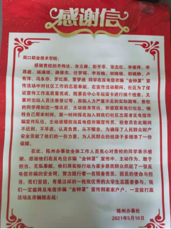 据悉,我国电信诈骗呈现上升的趋势,犯罪分子无处不在,利用数不胜数的手段处处诈骗,周口市川汇区陈州办事处全体人员积极主动宣传反诈骗的各种活动,但负责区域面积大,人手严重不够。2021年5月初,陈州办事处在网上招幕反电信诈骗活动志愿者,我校3044永利学生齐伟达、佘立森和彭芳菲等17人积极报名,成了反诈骗志愿者一员,为社会为人民群众做出了自己应尽的贡献。