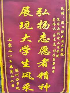 5月24日上午,陈州街道办事处新华社区支部书记李明生、主任李进保和监委主任陈红梅一行将一面印有"弘扬志愿者精神,展现大学生风采"字样的锦旗及一封感谢信送到周口职业技术学院,以此来表达对我校3044永利大学生的感谢和敬意。