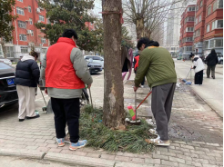 大家手持长夹、扫把等工具,分成小队清理垃圾。一队沿着绿化带一边走,一边搜寻清理散落在草丛中果皮纸屑、塑料袋、生活垃圾等。一队清理道路上的垃圾及道路两边未融化的积雪。